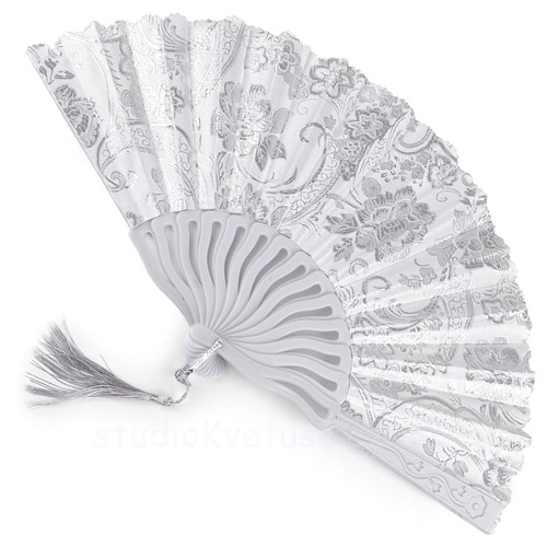 Vějíř se stříbrnou brokátovou látkou působí velmi luxusně a elegantně. Je protkaný lesklým lurexem. V dolní části má střapec. Vějíř využijete na společenské události i na karnevaly.
